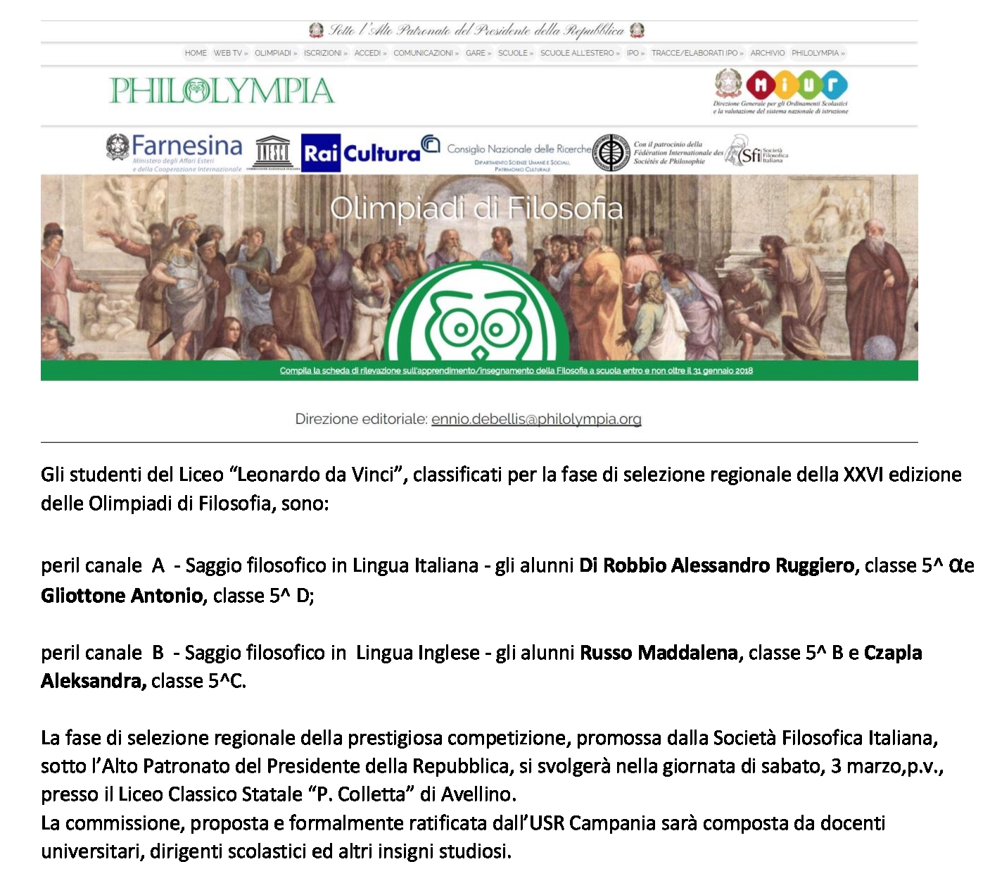Studenti classificati per la fase di selezione regionale della XXVI edizione delle Olimpiadi di Filosofia