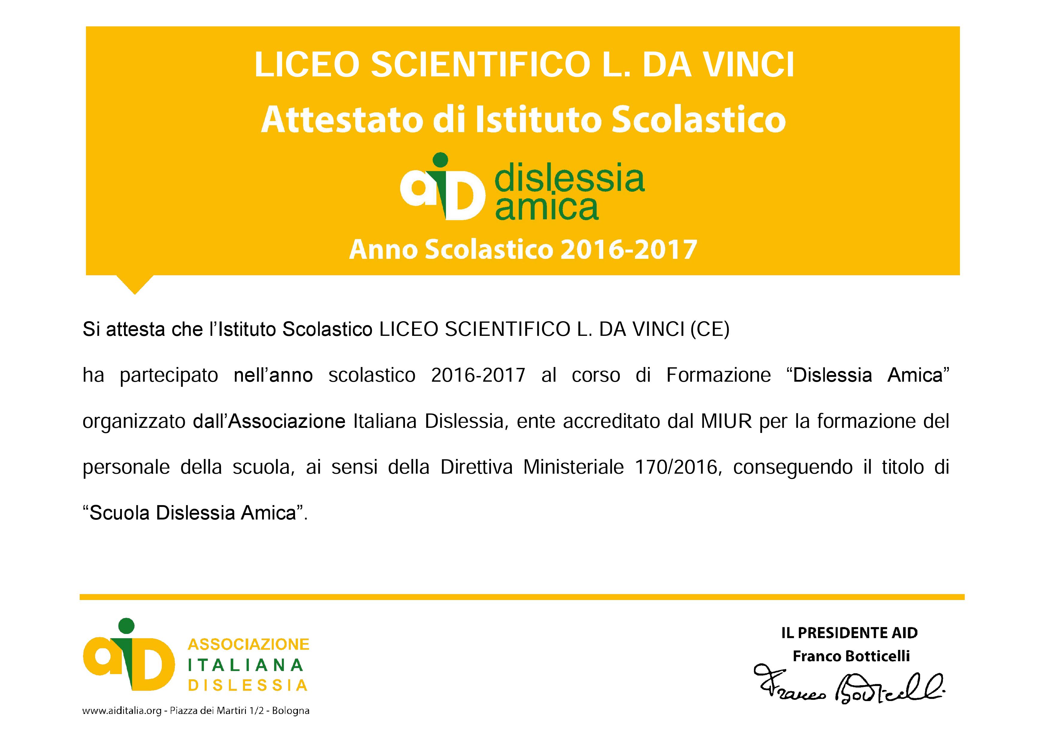 Il liceo "Leonardo da Vinci" ha partecipato nell’anno scolastico 2016-2017 al corso di Formazione “Dislessia Amica” organizzato dall’Associazione Italiana Dislessia, ente accreditato dal MIUR per la formazione del personale della scuola, ai sensi della Direttiva Ministeriale 170/2016 , conseguendo il titolo di